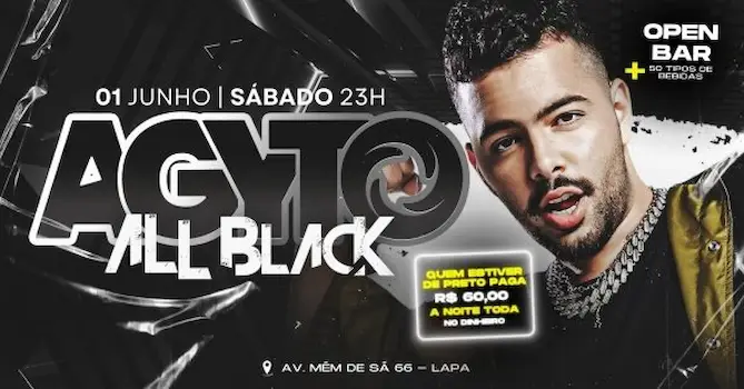 AGYTO, a sua casa de festas favorita te espera de braços abertos para uma noite incrível! Não perca tempo e garanta já o seu lugar nessa festa imperdível. Vem com tudo no ALL BLACK!