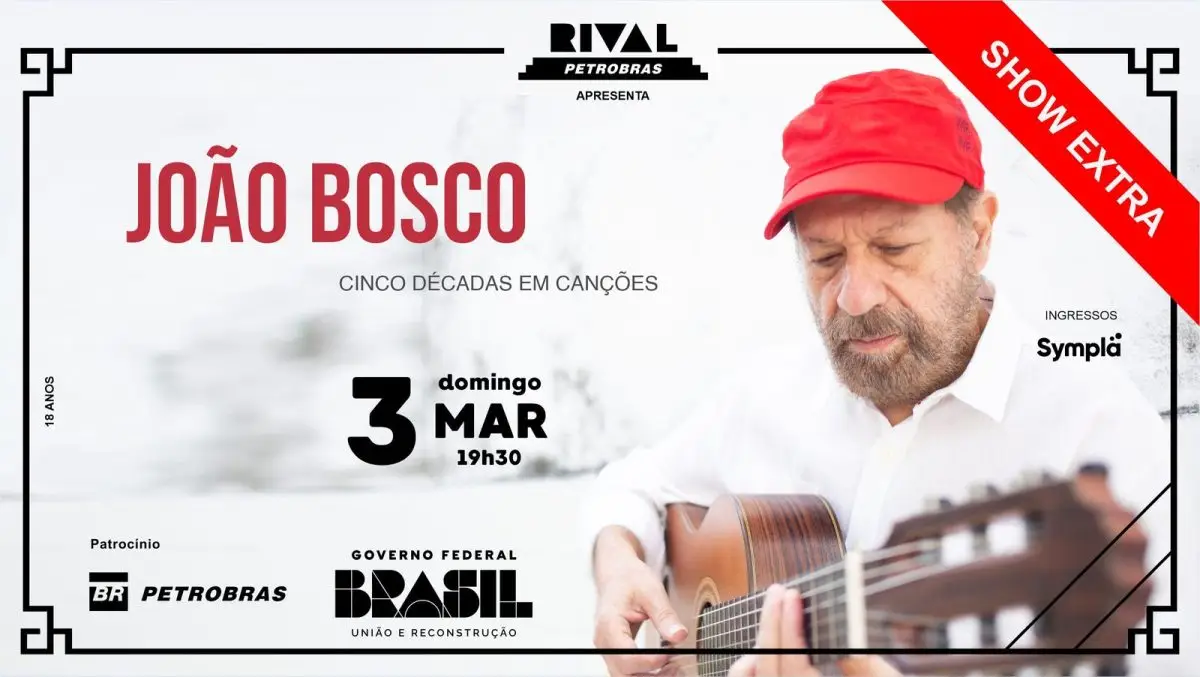 O show de João Bosco abrindo o Festival Teatro Rival Petrobras 90 anos no dia 2 de março teve ingressos esgotados em menos de 48 horas. Então, no dia seguinte, vai ter sessão extra do show “Cinco décadas em canções”. É mais uma alegria para o cantor e compositor, que está voltando de turnê mundial celebrando seus 50 anos de carreira.