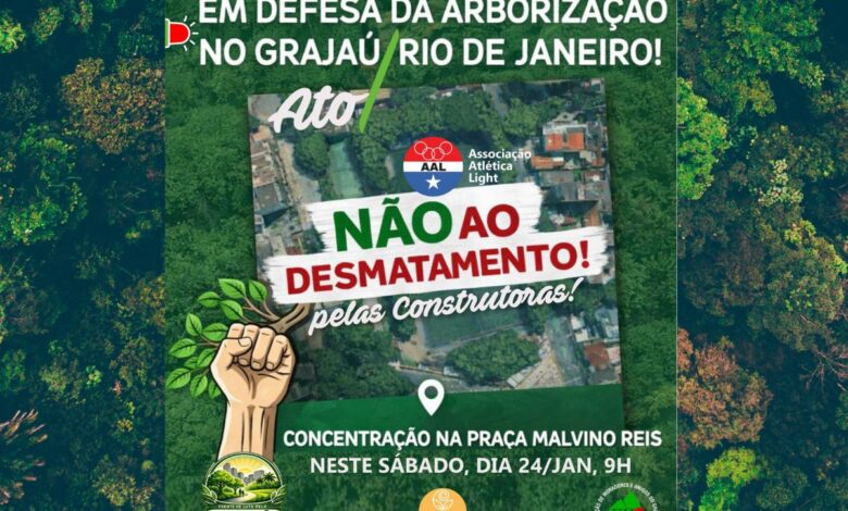 Moradores do Grajaú, na Zona Norte do Rio, realizam neste sábado, 24 de janeiro, uma manifestação contra a derrubada de 55 árvores no terreno onde funcionava o histórico Clube da Light, localizado na Rua Barão do Bom Retiro, 2002. O ato, convocado pela Associação de Moradores e Amigos do Grajaú (AMAGRAJA), está marcado para as 9h, com concentração na Praça Malvino Reis, seguindo em caminhada até o estande de vendas do empreendimento imobiliário em construção na área.