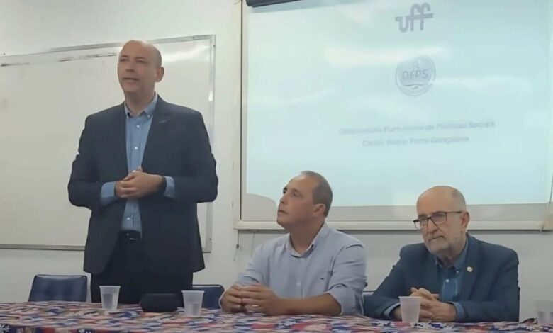 A imagem de divulgação do evento registra Fábio Barboza Passos, Vice-Reitor da UFF; Waldeck Carneiro, Professor Titular da UFF e Coordenador-Geral do OFPS; e Luiz Paulo Corrêa da Rocha, Deputado Estadual e um dos participantes do evento, durante o lançamento do Observatório Fluminense de Políticas Sociais Carlos Walter Porto-Gonçalves, em 2025.
